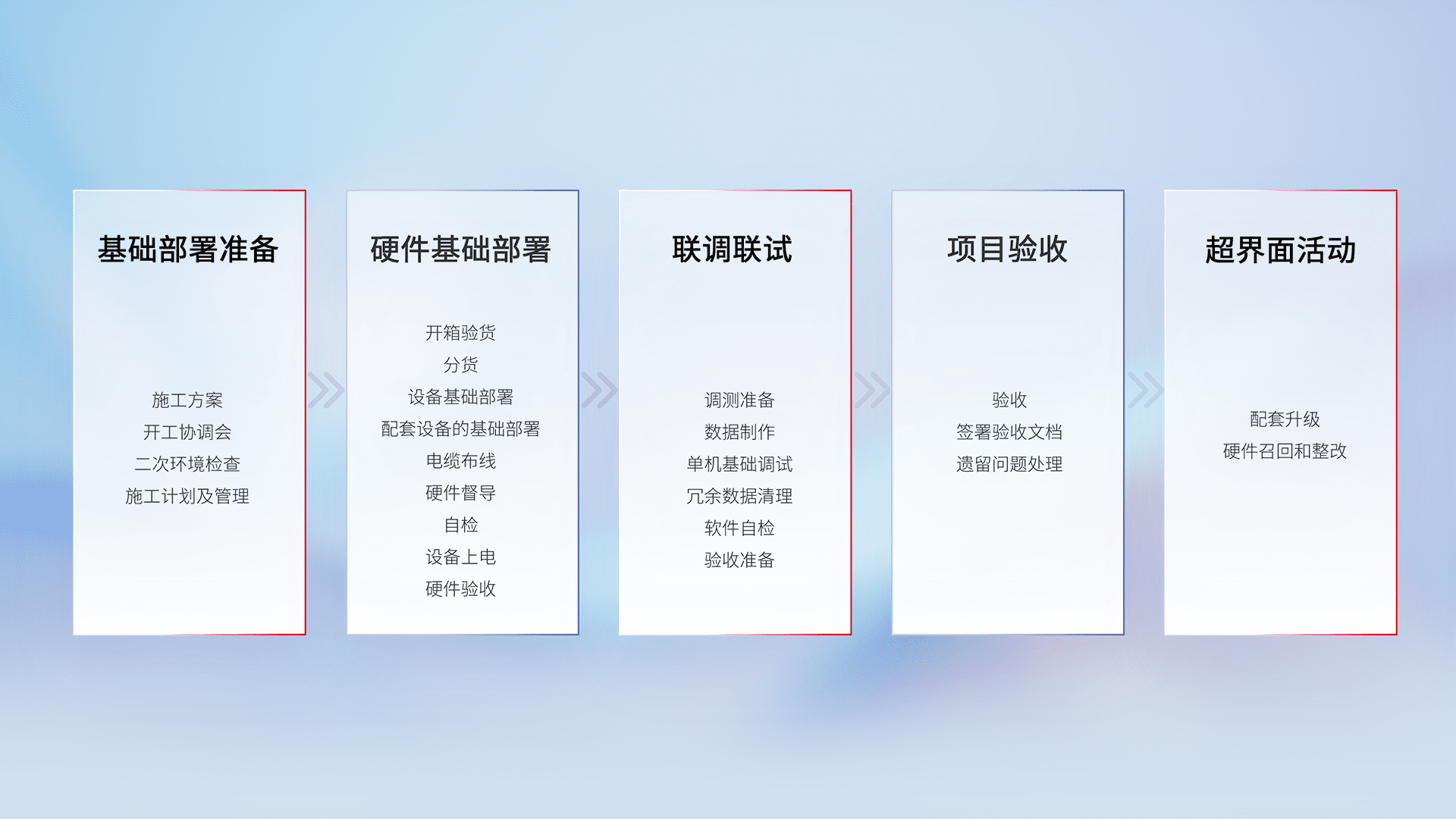 从基础部署准备、、硬件基础部署、、、、联调联试、、项目验收、、、、越界面活动的全过程可追溯,,保证施工质量和进度。。